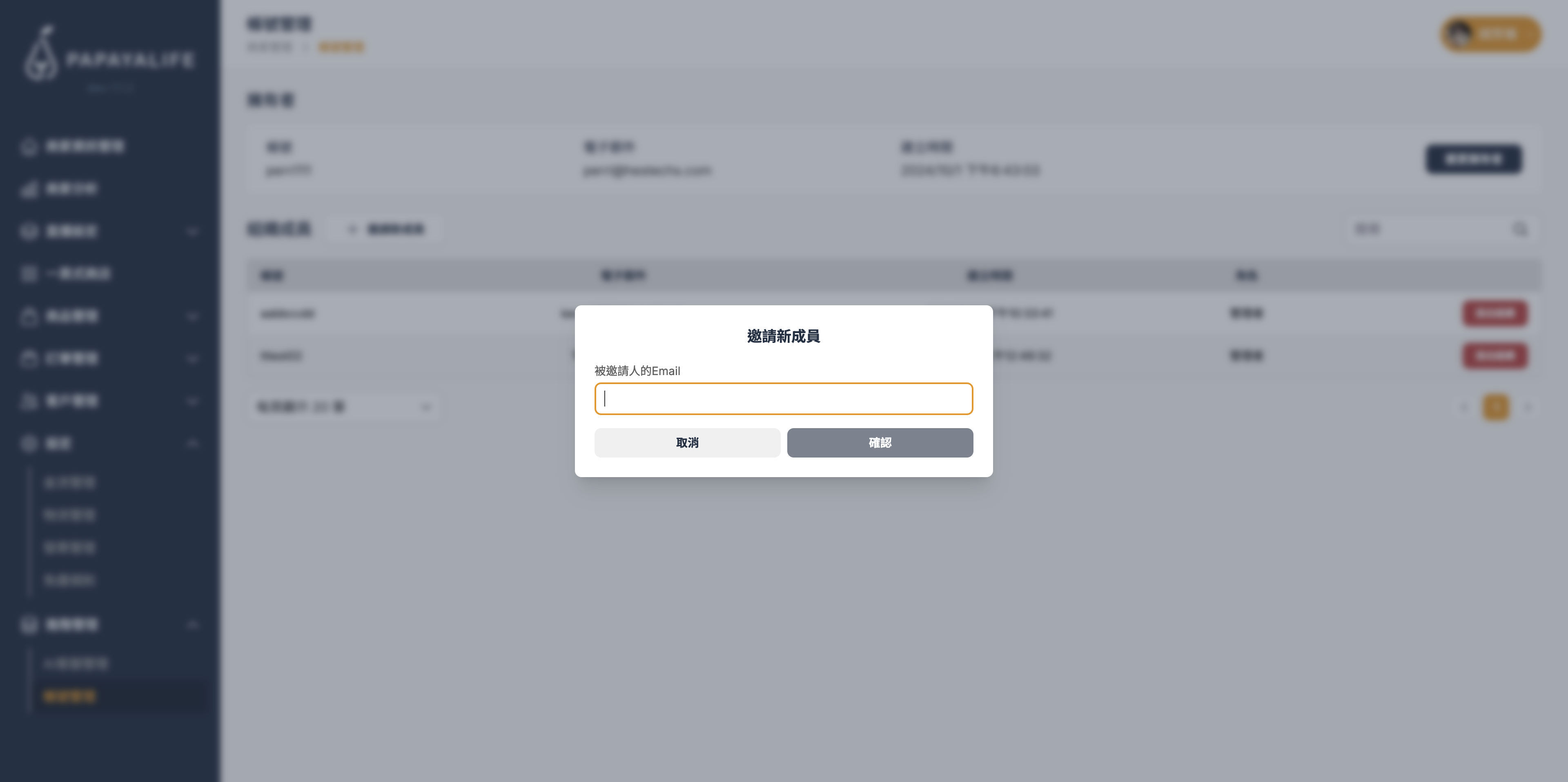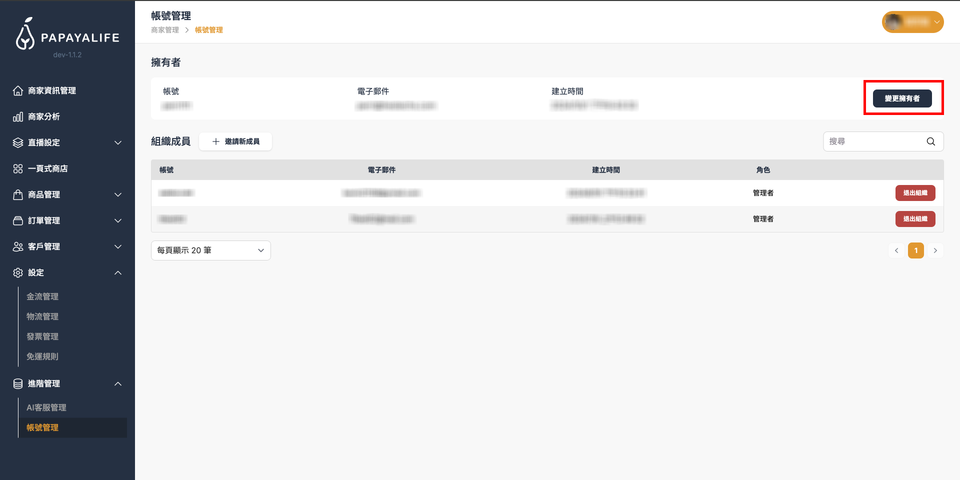 賣家成員管理¶ 查看、管理該商家所有管理者 點擊側邊欄中,進階管理⇒「帳號管理」,至帳號管理頁面 「擁有者」可進行「變更擁有者」、「邀請新成員」、「退出組織」的操作 變更擁有者¶ 點擊「變更擁有者」,點擊後跳出「選擇買家」視窗,可選擇組織成員為新的擁有者 選擇後點擊「確認」 邀請新成員¶ 點擊「邀請新成員」後,跳出邀請新成員視窗,輸入被邀請人的 Email,點擊「確認」 該邀請人會收到 Email 邀請信,確認後即成為該組織成員 退出組織¶ 點擊成員欄位右邊的「退出組織」按鈕,退出後該成員帳號將無法存取組織後台